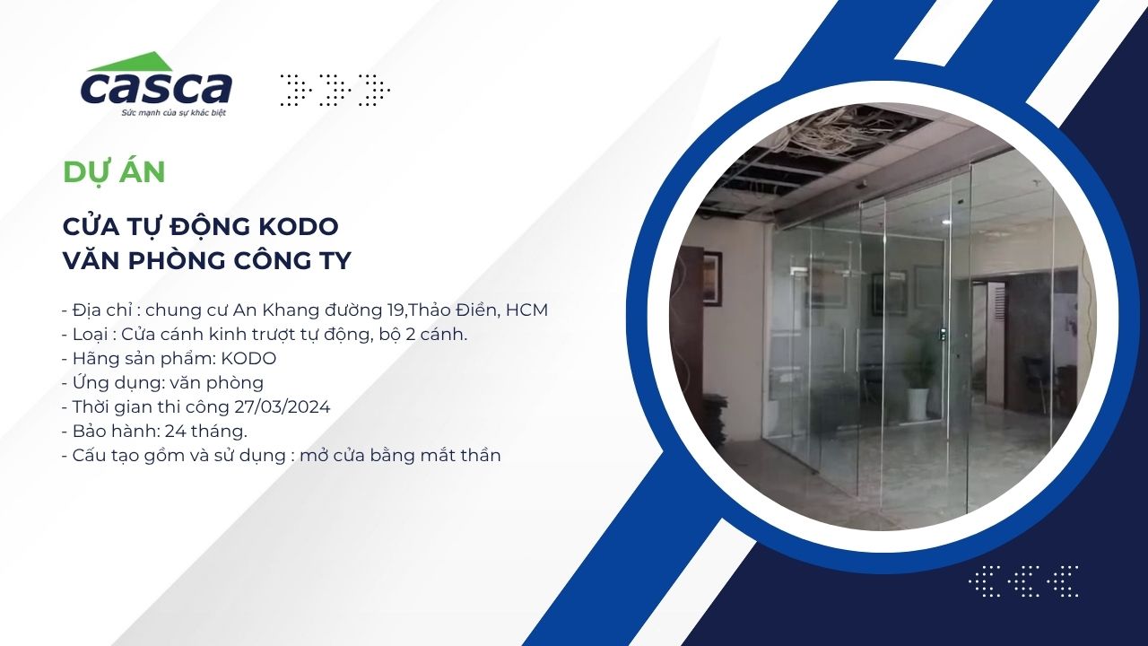 Ngày 27/03/2025, CASCA Việt Nam đã hoàn thiện và bàn giao hệ thống cửa kính trượt tự động KODO 2 cánh cho khu văn phòng tại chung cư An Khang, đường số 19, Thảo Điền, TP.HCM. Công trình ứng dụng cảm biến mắt thần KODO – giải pháp tự động hóa cao cấp, mang lại sự tiện nghi, an toàn và tính thẩm mỹ vượt trội cho khu vực làm việc.