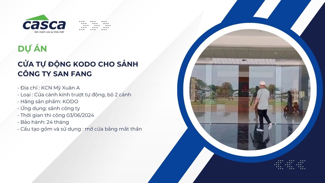 Dự án được hoàn thiện ngày 03/06/2024 tại KCN Mỹ Xuân A, hạng mục cửa kính trượt tự động KODO, bộ 2 cánh, lắp đặt tại sảnh chính công ty San Fang.