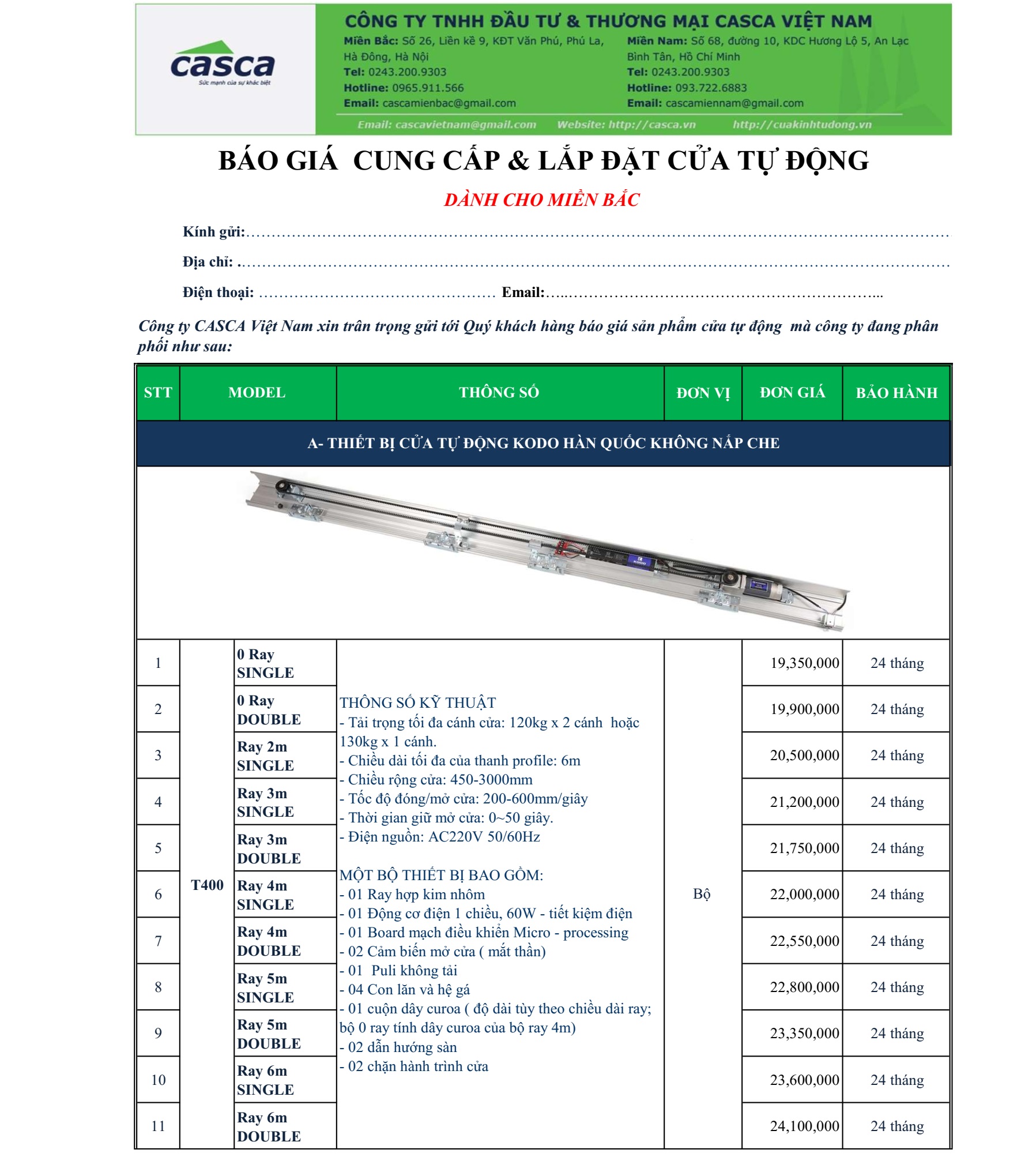 - Chỉ bán phân phối tới các khách hàng có đội ngũ thợ lắp đặt. Trường hợp khách hàng chưa lắp đặt thành thạo cửa tự động, nhân viên kỹ thuật của Casca Việt Nam sẽ hướng dẫn, đào tạo và hỗ trợ Khách hàng.