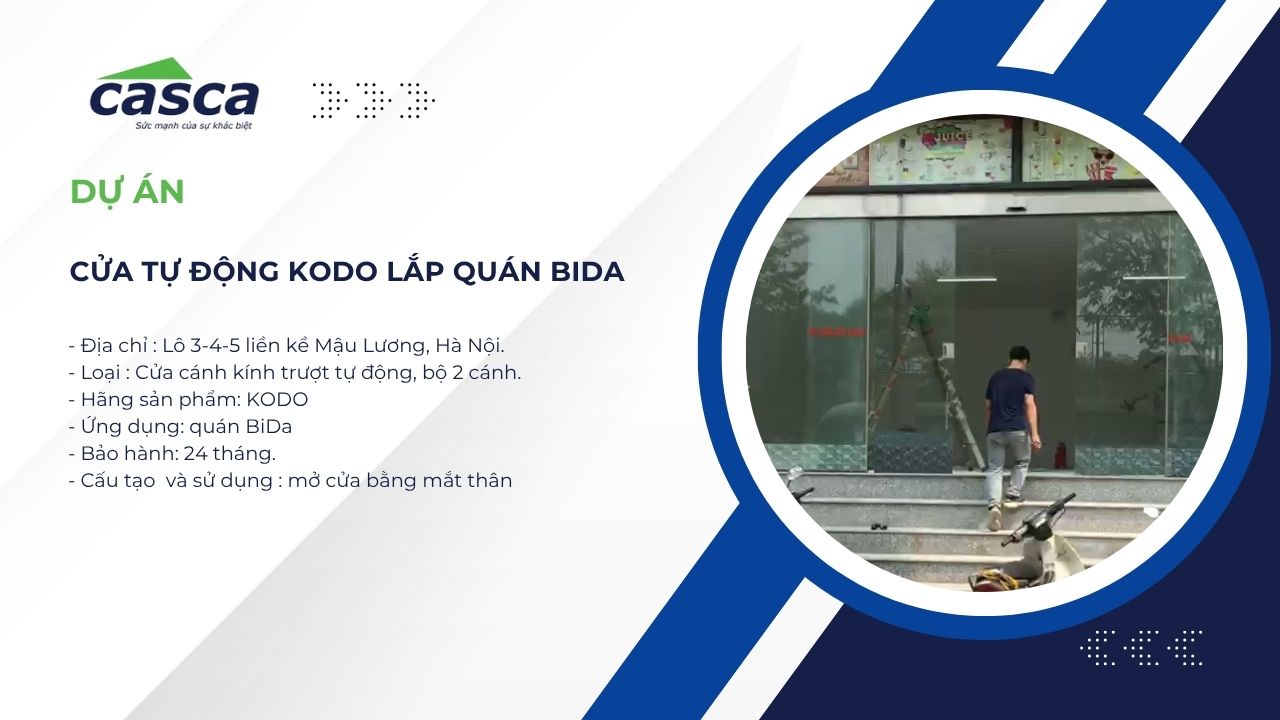 CASCA Việt Nam vừa hoàn thành dự án lắp đặt cửa kính trượt tự động KODO 2 cánh cho quán BiDa tại Lô 3-4-5 liền kề Mậu Lương, Kiến Hưng, Hà Đông, Hà Nội. Đây là công trình ứng dụng công nghệ tự động hóa hiện đại giúp tối ưu sự tiện nghi, nâng tầm không gian kinh doanh và đảm bảo an toàn tuyệt đối cho khách ra vào.