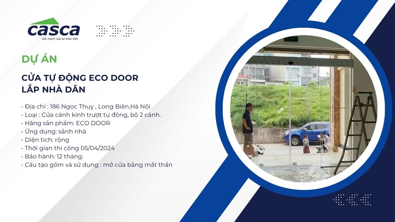Ngày 05/04/2025, CASCA Việt Nam đã bàn giao và đưa vào sử dụng hệ thống cửa kính trượt tự động ECO DOOR 2 cánh tại nhà dân 186 Ngọc Thuỵ, Long Biên, Hà Nội. Đây là dòng cửa tự động cao cấp ứng dụng công nghệ mắt thần hồng ngoại, cho phép cửa tự động mở khi phát hiện chuyển động, giúp người dùng di chuyển thuận tiện, đặc biệt trong không gian nhà phố hiện đại.