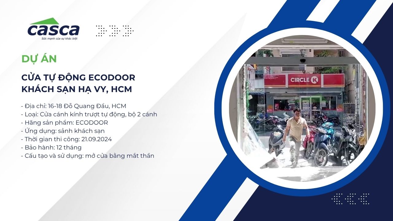 Khách sạn Hạ Vy là một trong những điểm lưu trú nổi bật tại trung tâm Quận 1 – khu vực sôi động bậc nhất TP.HCM. Với mục tiêu nâng tầm trải nghiệm đón tiếp khách quốc tế, khách sạn mong muốn nâng cấp hệ thống cửa ra vào sảnh chính bằng giải pháp cửa kính trượt tự động ECODOOR – dòng sản phẩm nổi bật được phân phối và thi công bởi CASCA Việt Nam. Với hơn 10 năm kinh nghiệm trong lĩnh vực cửa tự động, CASCA được tin tưởng lựa chọn làm đối tác triển khai toàn bộ hạng mục quan trọng này.