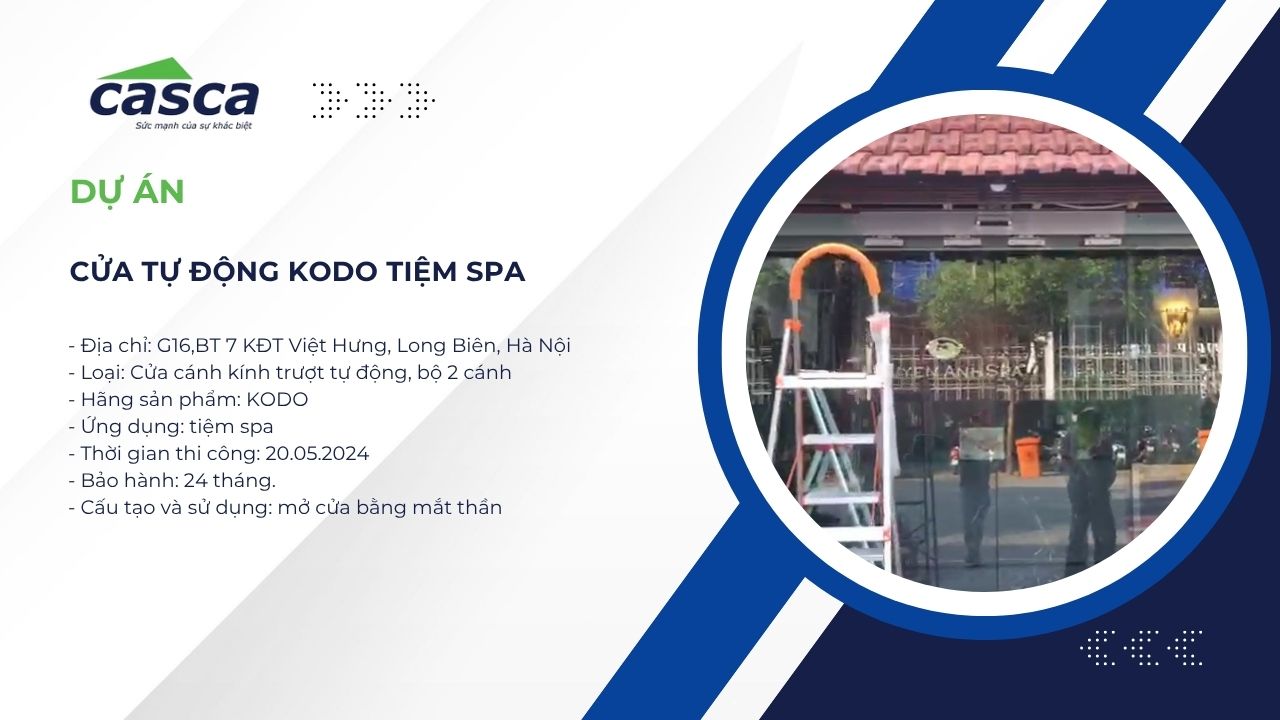 Trong không gian spa – nơi đề cao sự thư giãn và tính thẩm mỹ, từng chi tiết thiết kế đều có vai trò quan trọng trong việc tạo nên cảm xúc cho khách hàng. Cửa tự động không chỉ là một thiết bị hỗ trợ vận hành, mà còn là điểm chạm đầu tiên trong hành trình trải nghiệm dịch vụ. Với dự án Cửa trượt tự động KODO tại Tiệm Spa Việt Hưng, CASCA Việt Nam mang đến giải pháp công nghệ hiện đại kết hợp thiết kế tinh tế, giúp không gian spa trở nên sang trọng, yên tĩnh và chuyên nghiệp hơn.