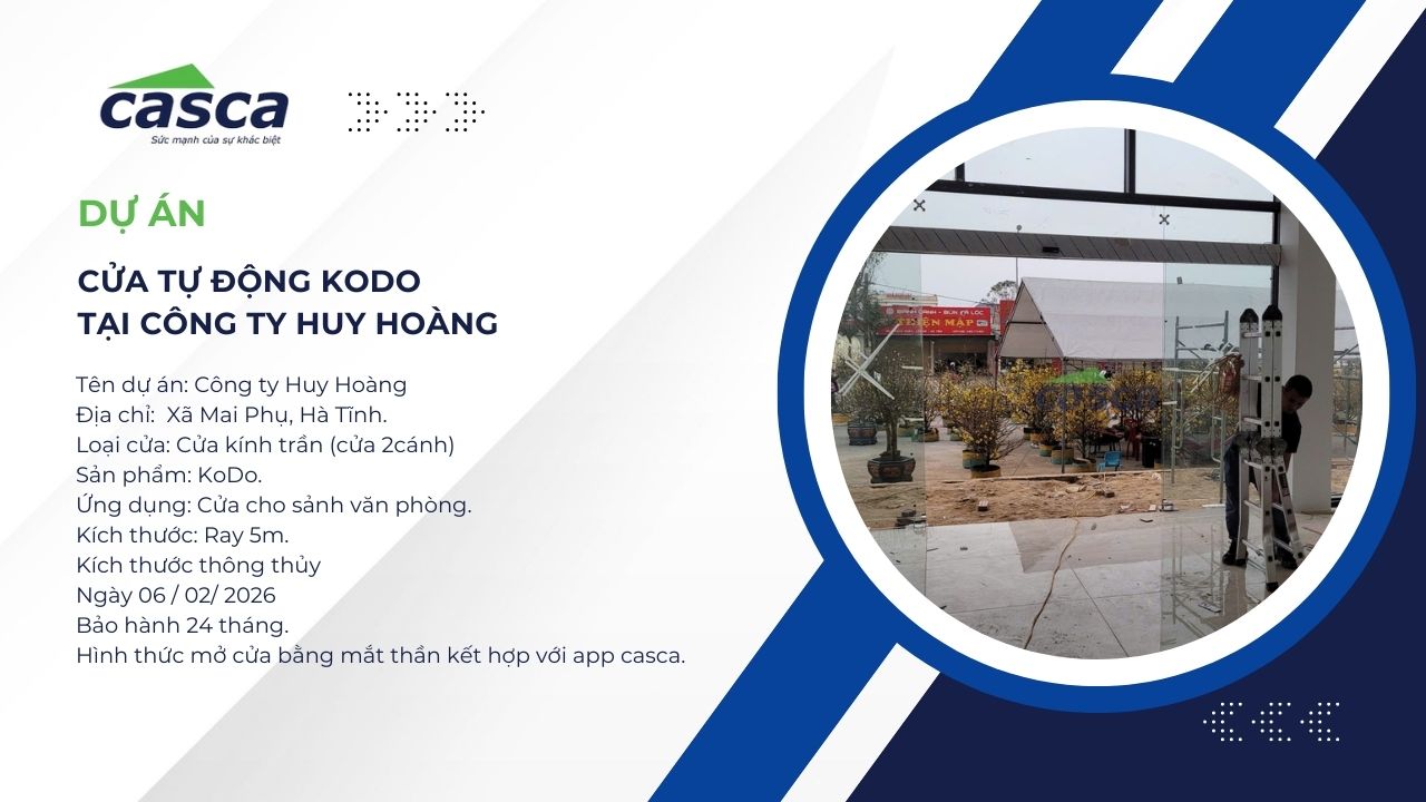 Công trình trụ sở làm việc của Công ty Huy Hoàng (Hà Tĩnh) vừa qua đã được khoác lên mình diện mạo mới hiện đại và sang trọng hơn nhờ hệ thống cửa tự động cao cấp. Đây là dự án trọng điểm mà CASCA Việt Nam vinh dự được lựa chọn làm đơn vị tư vấn và thi công trọn gói, khẳng định vị thế dẫn đầu trong lĩnh vực cung cấp giải pháp lối ra vào thông minh tại khu vực miền Trung.