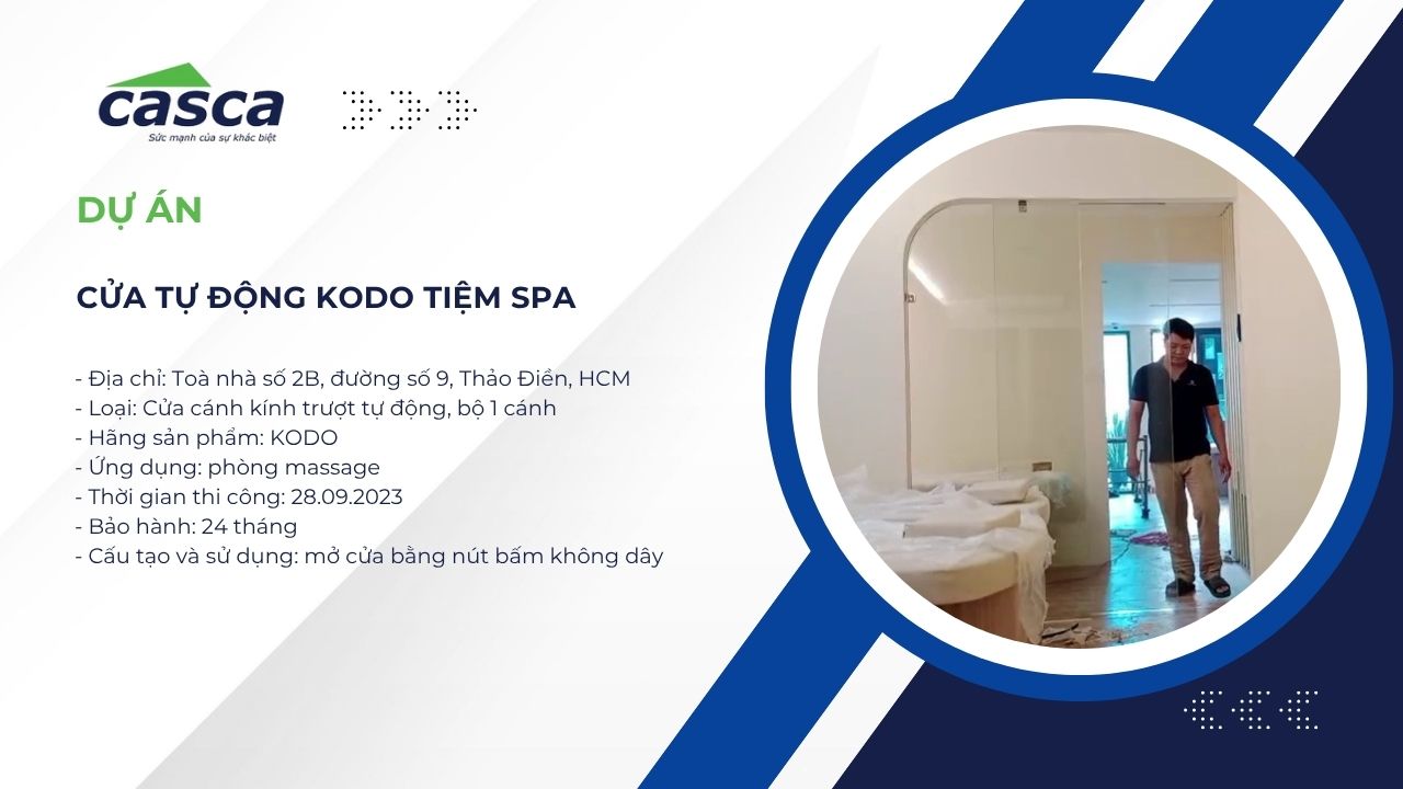 Trong xu hướng hiện đại hóa không gian sống và kinh doanh, cửa tự động đang dần trở thành lựa chọn phổ biến cho các công trình sang trọng như spa, khách sạn, showroom hay nhà ở cao cấp. Sự kết hợp giữa công nghệ và thẩm mỹ không chỉ mang lại trải nghiệm tiện nghi mà còn khẳng định đẳng cấp của chủ đầu tư. Dự án Cửa kính trượt tự động KODO tại Tiệm Spa Thảo Điền, Quận 2 là minh chứng rõ ràng cho sự giao thoa hoàn hảo giữa kỹ thuật tiên tiến và thiết kế tinh tế, được thực hiện bởi CASCA Việt Nam – thương hiệu dẫn đầu trong lĩnh vực cửa tự động tại Việt Nam.