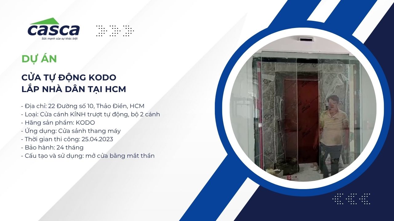 Không chỉ dành riêng cho trung tâm thương mại hay toà nhà văn phòng, cửa tự động KODO ngày càng được ứng dụng nhiều trong các công trình dân dụng cao cấp. Dự án tại 22 Đường số 10, Thảo Điền, Quận 2, TP.HCM là một ví dụ tiêu biểu, nơi CASCA Việt Nam mang đến giải pháp cửa tự động sang trọng, phù hợp với phong cách kiến trúc hiện đại và nhu cầu sử dụng thực tế của gia chủ.