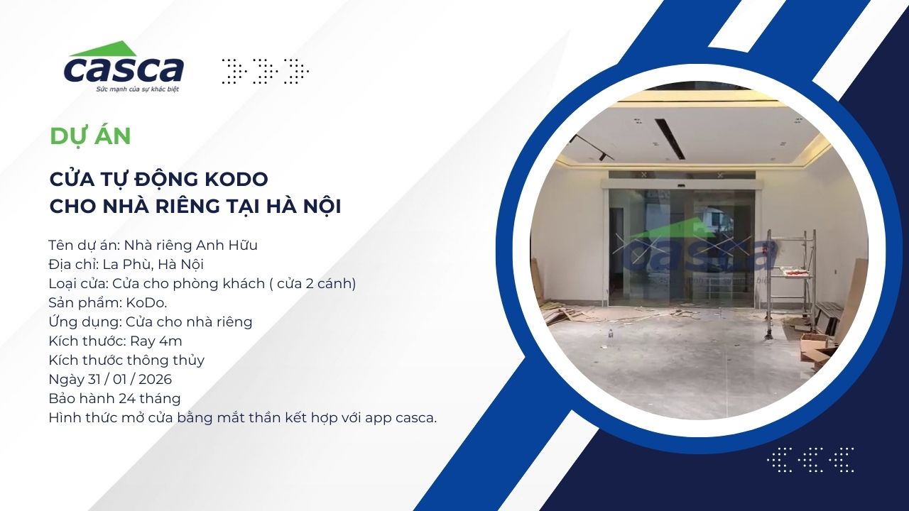 Trong kỷ nguyên của kiến trúc thông minh, cửa tự động đã vượt ra khỏi giới hạn của các tòa nhà thương mại để trở thành điểm nhấn tiện nghi cho các tư gia đẳng cấp. Mới đây, Casca Việt Nam vinh dự hoàn thiện và bàn giao hệ thống cửa trượt tự động KODO nhập khẩu Hàn Quốc cho biệt thự gia đình anh Hữu tại La Phù, Hoài Đức. Công trình là sự giao thoa hoàn hảo giữa công nghệ 4.0 và thiết kế nội thất sang trọng.
