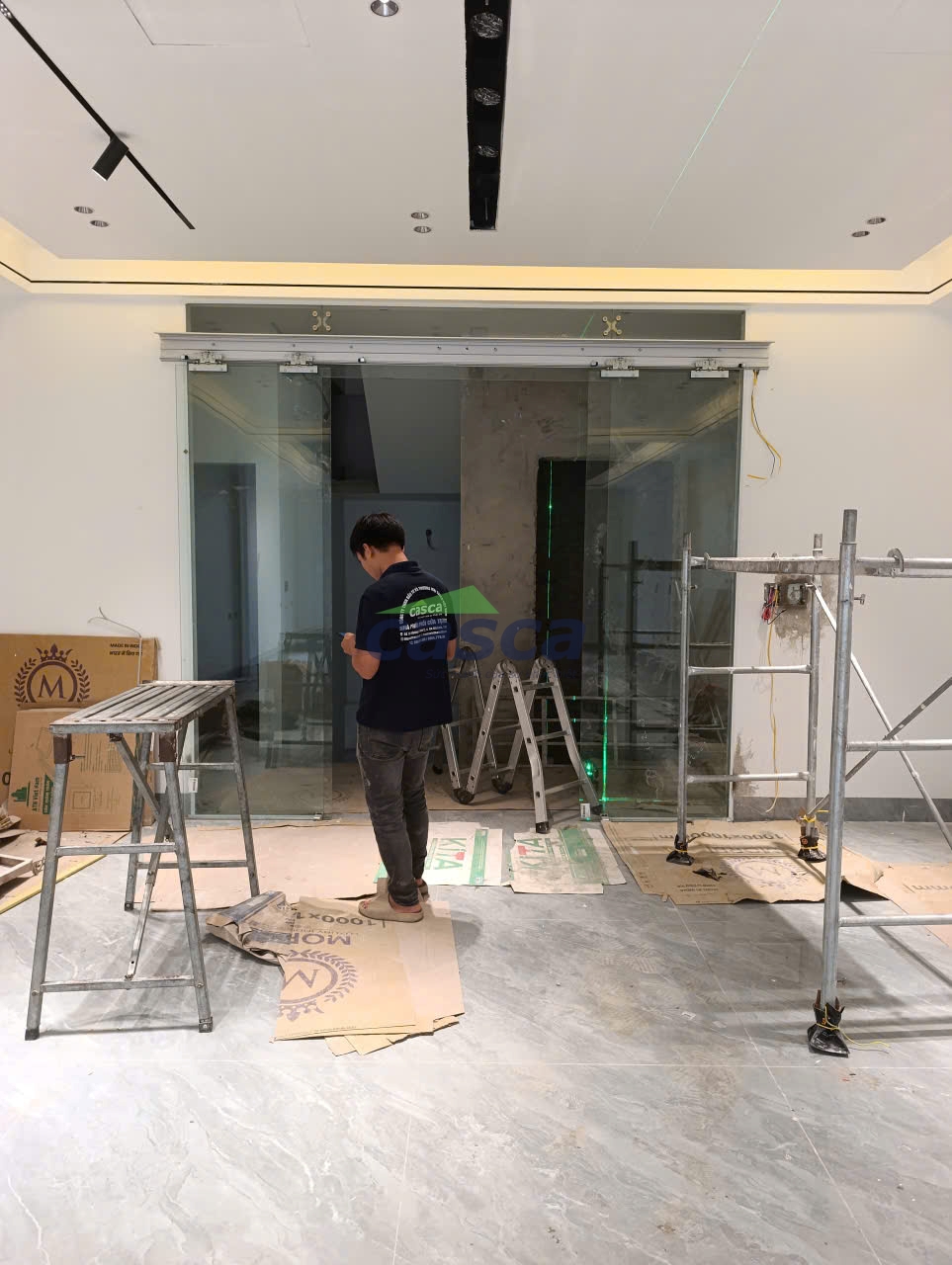 Với khẩu độ mở rộng của phòng khách, chúng tôi sử dụng thanh ray dài 4m để tối đa hóa lối đi thông thủy. Điểm khác biệt trong kỹ thuật thi công của Casca nằm ở việc sử dụng kính cường lực 12mm kết hợp với kẹp kính khoan lỗ. Khác với các loại kẹp ma sát thông thường, kẹp khoan lỗ giúp định vị cánh cửa chắc chắn hơn gấp nhiều lần, loại bỏ hoàn toàn nguy cơ tụt kính sau thời gian dài sử dụng, đảm bảo an toàn tuyệt đối cho gia đình có trẻ nhỏ.