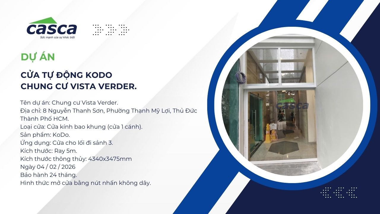 Vừa qua, CASCA Việt Nam vinh dự được lựa chọn là đơn vị nhà thầu chính thức cho hạng mục thi công hệ thống cửa sảnh ra vào tại Chung cư Vista Verder. Đây là khu căn hộ cao cấp đòi hỏi tiêu chuẩn khắt khe về thẩm mỹ, độ ồn thấp và tính năng an toàn tuyệt đối cho cư dân.