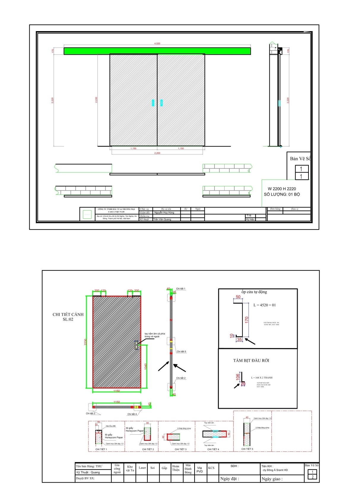 Theo thiết kế, hệ thống gồm 2 cánh INOX 304 dày 1.0mm, kích thước mỗi cánh rộng 1100mm, cao 2220mm, tổng chiều rộng cửa đạt 2200mm, giúp tối ưu không gian ra vào cho xe nâng và xe đẩy hàng. Phần khung bao và ray trượt được chế tạo từ nhôm định hình liền khối, gia cố thêm bộ nẹp chống rung để giảm ồn và tăng tuổi thọ khi vận hành liên tục. Bên dưới, bộ bánh xe kép chịu tải trọng đến 90kg/cánh được lắp trên hệ ray trượt treo, đảm bảo chuyển động êm, nhẹ và chính xác.