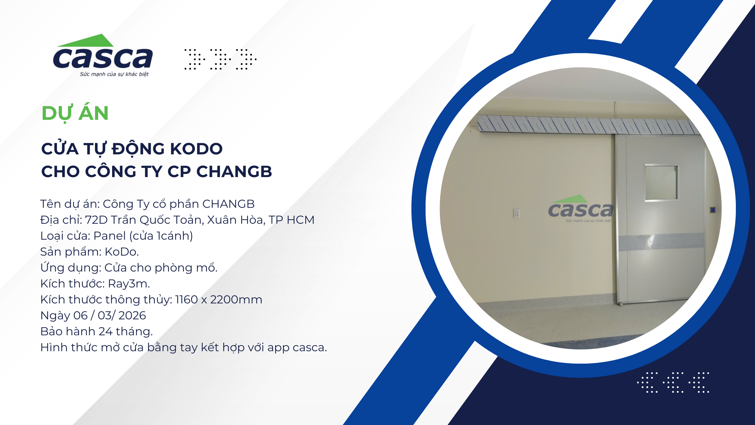 Trong xu thế hiện đại hóa hạ tầng doanh nghiệp, việc ứng dụng các giải pháp tự động hóa lối ra vào không chỉ giúp tối ưu quy trình vận hành mà còn khẳng định đẳng cấp của đơn vị. Vừa qua, CASCA Việt Nam đã triển khai thành công dự án lắp đặt hệ thống cửa tự động thông minh cho Công ty Cổ phần CHANGB tại TP. Hồ Chí Minh. Dự án này là sự kết hợp hoàn hảo giữa vật liệu Panel bền bỉ và công nghệ điều khiển từ xa, mang lại không gian làm việc chuyên nghiệp, an toàn và cực kỳ hiện đại cho khách hàng.