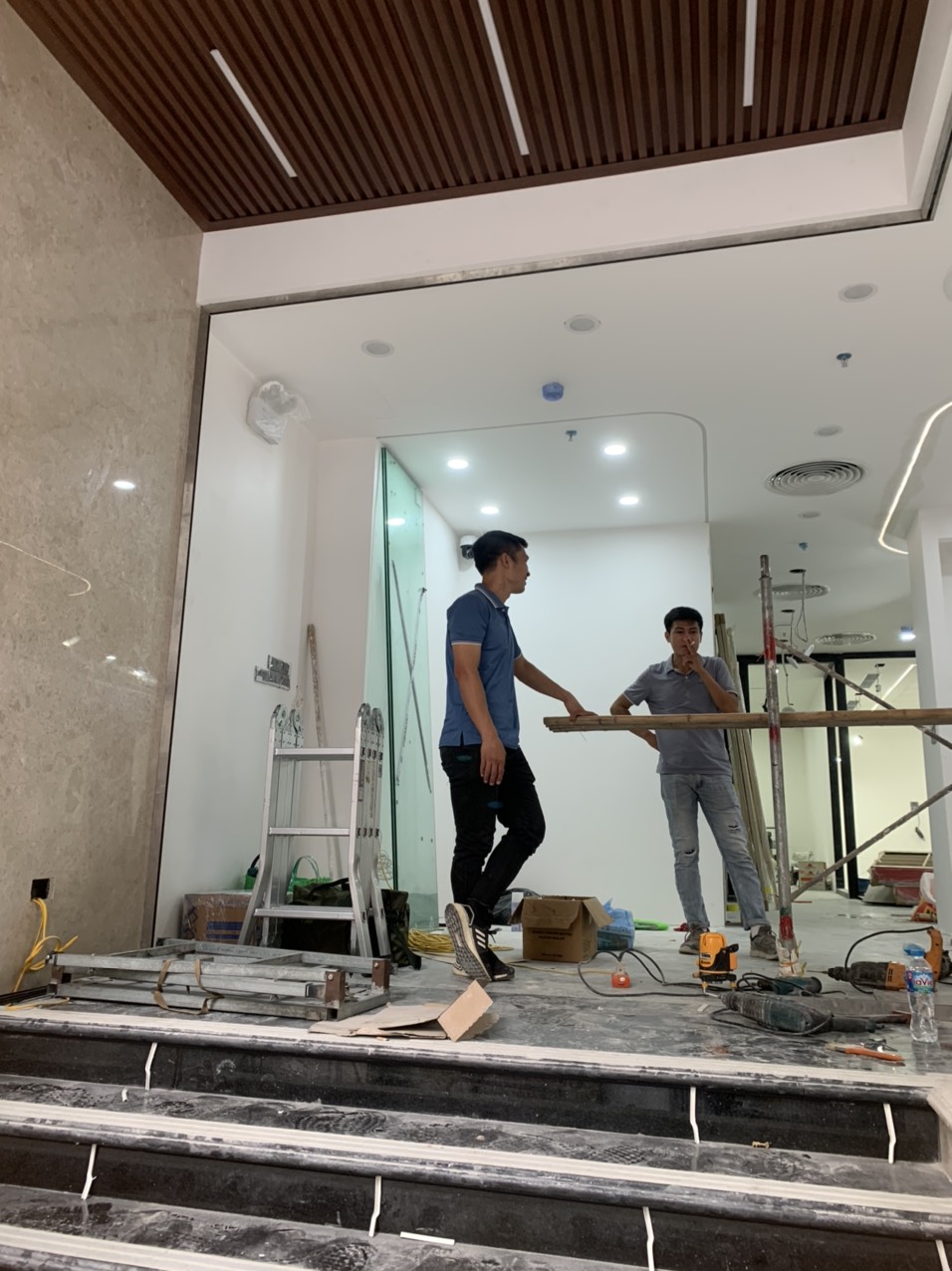- Thi công lắp đặt khung & ray trượt: Khung nhôm và ray trượt được căn chỉnh bằng laser để đảm bảo độ vuông góc tuyệt đối. Mỗi điểm liên kết giữa khung – ray – tường đều được cố định bằng bu lông nở thép chống rung, giúp hệ thống vận hành ổn định lâu dài.