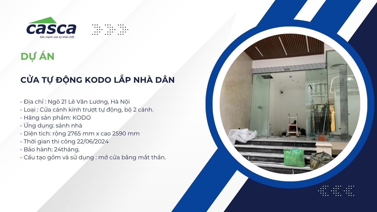 Dự án lắp đặt cửa kính trượt tự động KODO tại ngõ 21 Lê Văn Lương, Thanh Xuân, Hà Nội là một trong những công trình dân dụng nổi bật được thực hiện bởi CASCA Việt Nam trong năm 2024. Hệ thống cửa 2 cánh kính cường lực, điều khiển bằng cảm biến mắt thần tự động, mang đến sự tiện nghi, sang trọng và an toàn tuyệt đối cho ngôi nhà.