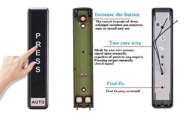 Nút bấm cửa tự động có dây không sử dụng nguồn điện và không sử dụng pin cũng như bộ nhận tín hiệu như nút bấm không dây. Nút bấm có dây đơn giản chỉ là công tắc nhấn để tác động tới tín hiệu mở cửa của thiết bị cửa tự động.